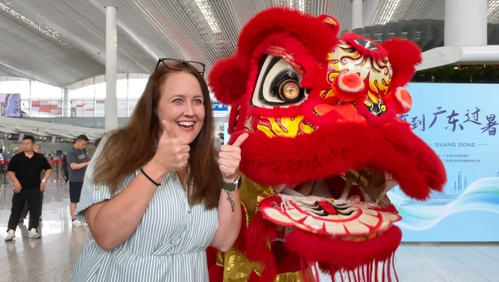 上午10点,随着铿锵有力的鼓点,岭南狮舞闪亮登场,表演者们用烈的舞姿,向旅客们展示了广东的热情好客。来自美国的旅客Carol在观看醒狮表演后,对白云机场的服务连连赞叹。她表示,机场航站楼设备很新,而且十分便捷,转机或者停留时各种配套服务周全,之前在缅甸教书时,偶尔回美国也会到广州白云机场转机。