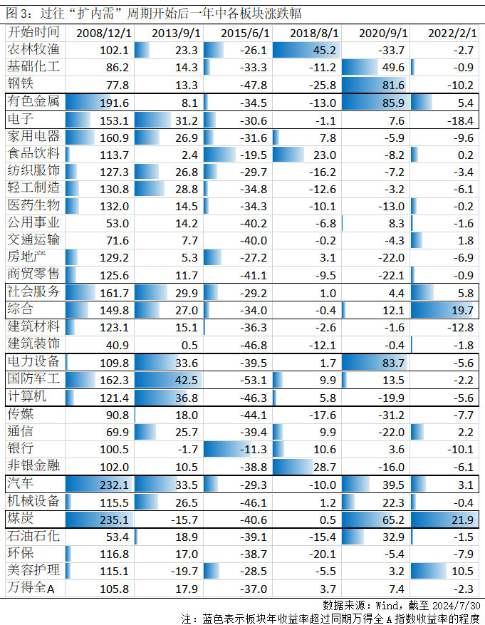 此次“扩内需”过程中有三种类型的板块值得关注:(1)财政政策定向支持的板块,如家用电器、汽车、交通运输等,逻辑是政策资金支持;(2)顺周期板块,如有色金属、煤炭、社会服务等,逻辑是宏观经济改善;(3)具备产业逻辑的成长板块,如电子、电力设备等,逻辑是风险偏好提升。依据对过往“扩内需”周期(财政支出增速上行、货币政策宽松)的回顾,这些板块在“周期”开始后的一年中普遍有较高的超额收益。