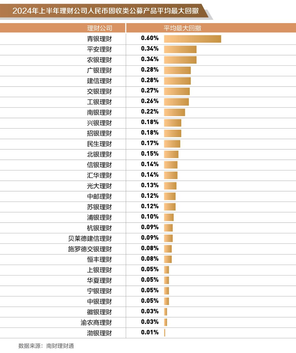 从风险指标来看,2024年上半年存续人民币固收类产品平均最大回撤幅度最大的是青银理财,平均最大回撤0.6%。其次是农银理财和平安理财,上半年最大回撤平均值均为0.34%。