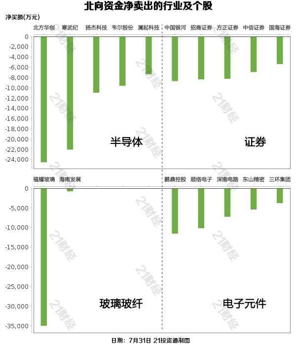 北向资金减持了13个行业,其中半导体最多,净卖出金额达3.09亿元,其次是证券行业,净卖出3.00亿元。