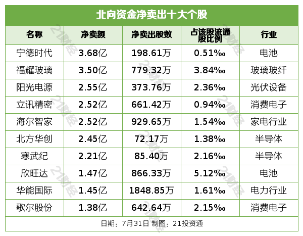 北向资金净卖出宁德时代(300750.SZ)、福耀玻璃(600660.SH)、阳光电源(300274.SZ)、立讯精密(002475.SZ)、海尔智家(600690.SH)居前,其中,宁德时代被净卖出3.68亿元,福耀玻璃被净卖出3.50亿元,阳光电源被净卖出2.55亿元,立讯精密被净卖出2.52亿元,海尔智家被净卖出2.52亿元。