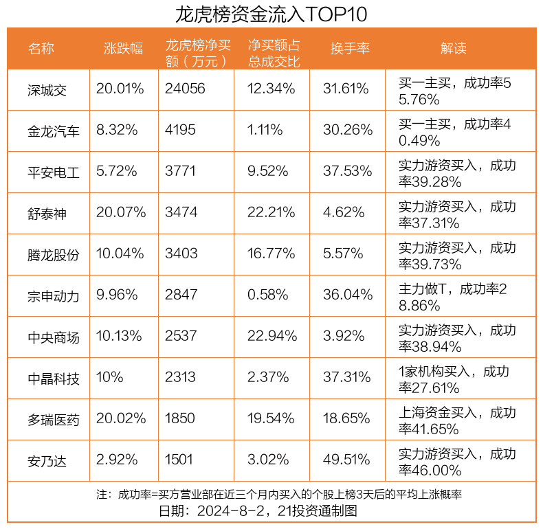8月2日,上证指数下跌0.92%,深证成指下跌1.38%,创业板指下跌1.66%。盘后龙虎榜数据显示,共有46只个股因当日异动登上龙虎榜,资金净流入最多的是深城交(301091.SZ),达2.41亿元。
