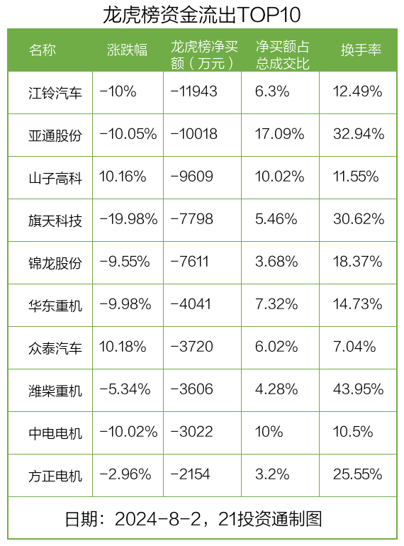 而龙虎榜中资金净流出最多的是江铃汽车(000550.SZ),被净卖出为1.19亿元,占总成交金额的6.3%。江铃汽车收盘下跌10%,换手率为12.49%。