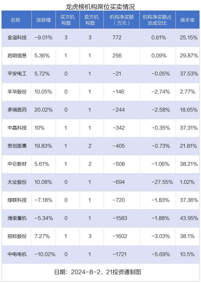 8月2日,13只个股龙虎榜出现了机构的身影,机构合计净卖出6957万元。具体来看,机构净买入2股,净卖出11股。