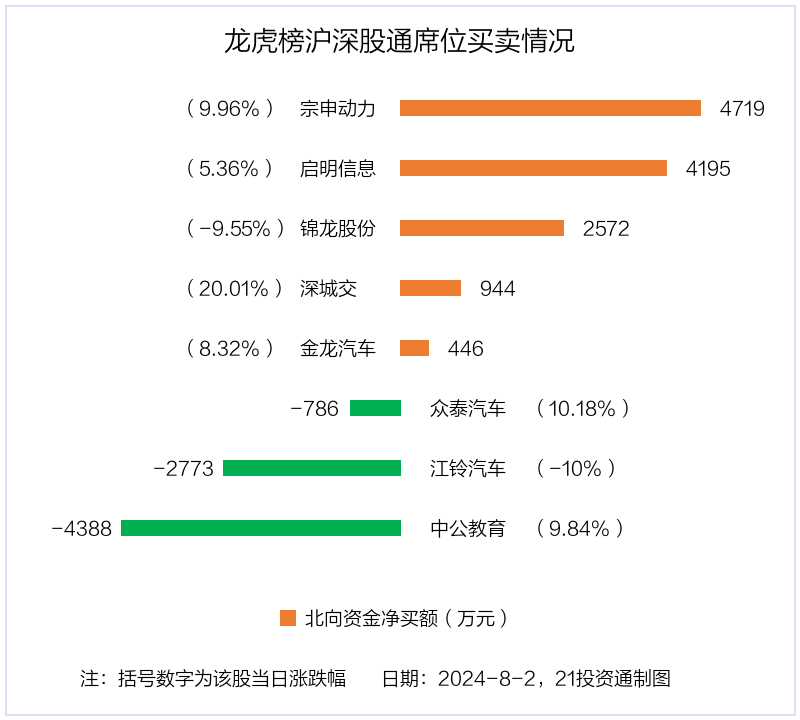 8月2日,北向资金参与龙虎榜中的个股共有8只,合计净买入4930.25万元。其中沪股通净买入1 股,合计净买入446.39万元;深股通净买入4 股,净卖出3 股,合计净买入4483.86万元。