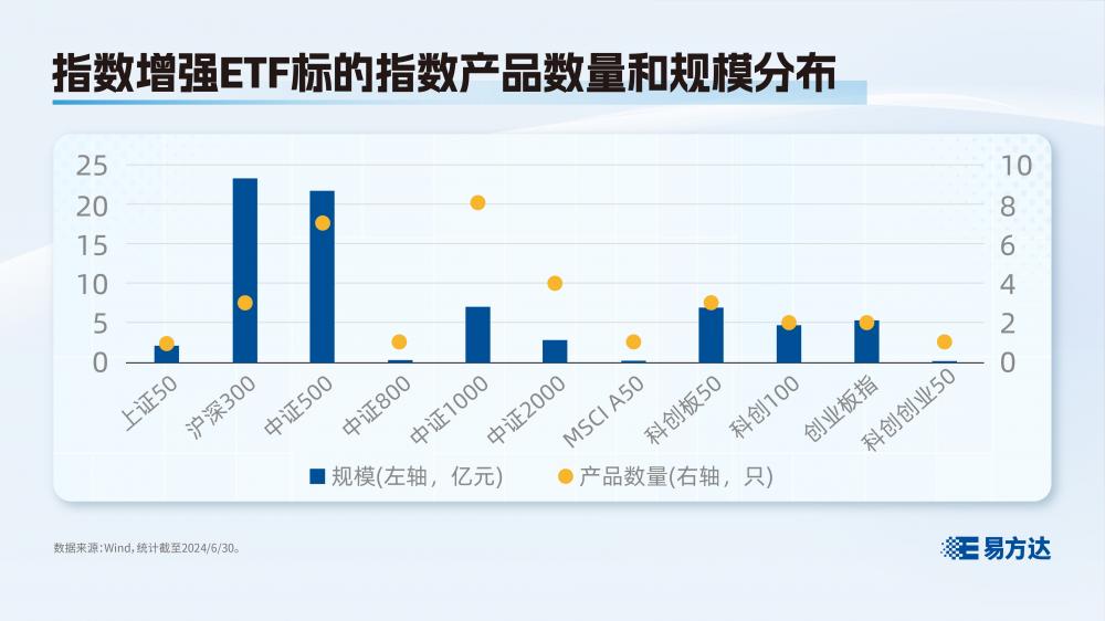 从产品分布来看,目前指数增强ETF的标的指数均为宽基指数,例如上证50、中证500、科创100等,覆盖了大、中、小盘不同风格。