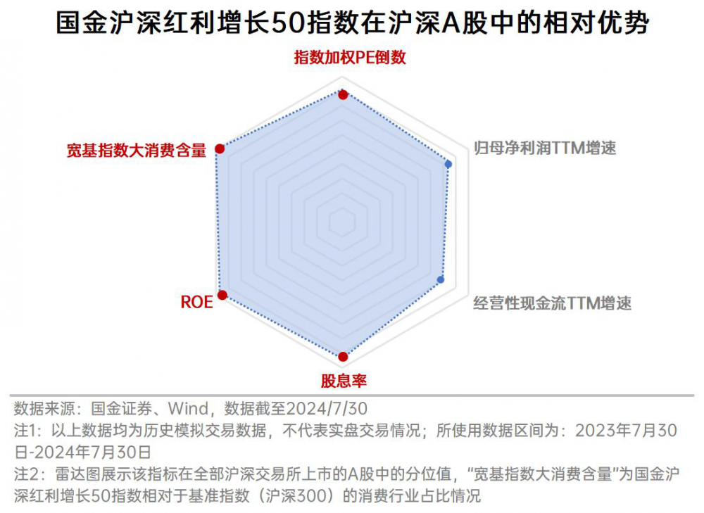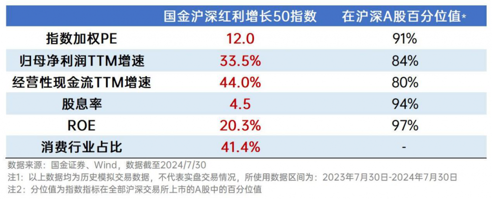 “国金沪深红利增长50指数”在估值、成长性、盈利能力、股息率等方面表现亮眼。据国金指数计算,其一,国金沪深红利增长50指数的加权平均PE约为12.0,不仅有效反映了市场预期,也表明该指数整体拥有较高的安全边际。其二,约41%的指数成分股属于需求稳定性较高、具有增长潜力、受周期影响较小的消费行业,体现出该指数拥有较强的抗风险能力和较高增长质量的发展路径。其三,从成长性指标来看,指数成分股在归母净利润增速、经营性现金流增速等方面均优于市场平均水平,这说明该指数的构建规则有效融入了上市公司的高成长性和未来行业前景。其四,从盈利能力来看,该指数的加权平均ROE约为20.3%,位于市场水平的较高分位值,这代表相关上市公司的资金使用效率较高、业务价值较高。其五,从派发股息的视角来看,该指数的加权平均股息率位于市场分位数较高的区域,而分红稳定、高股息率的特点在当前低利率环境下也具有较高吸引力。