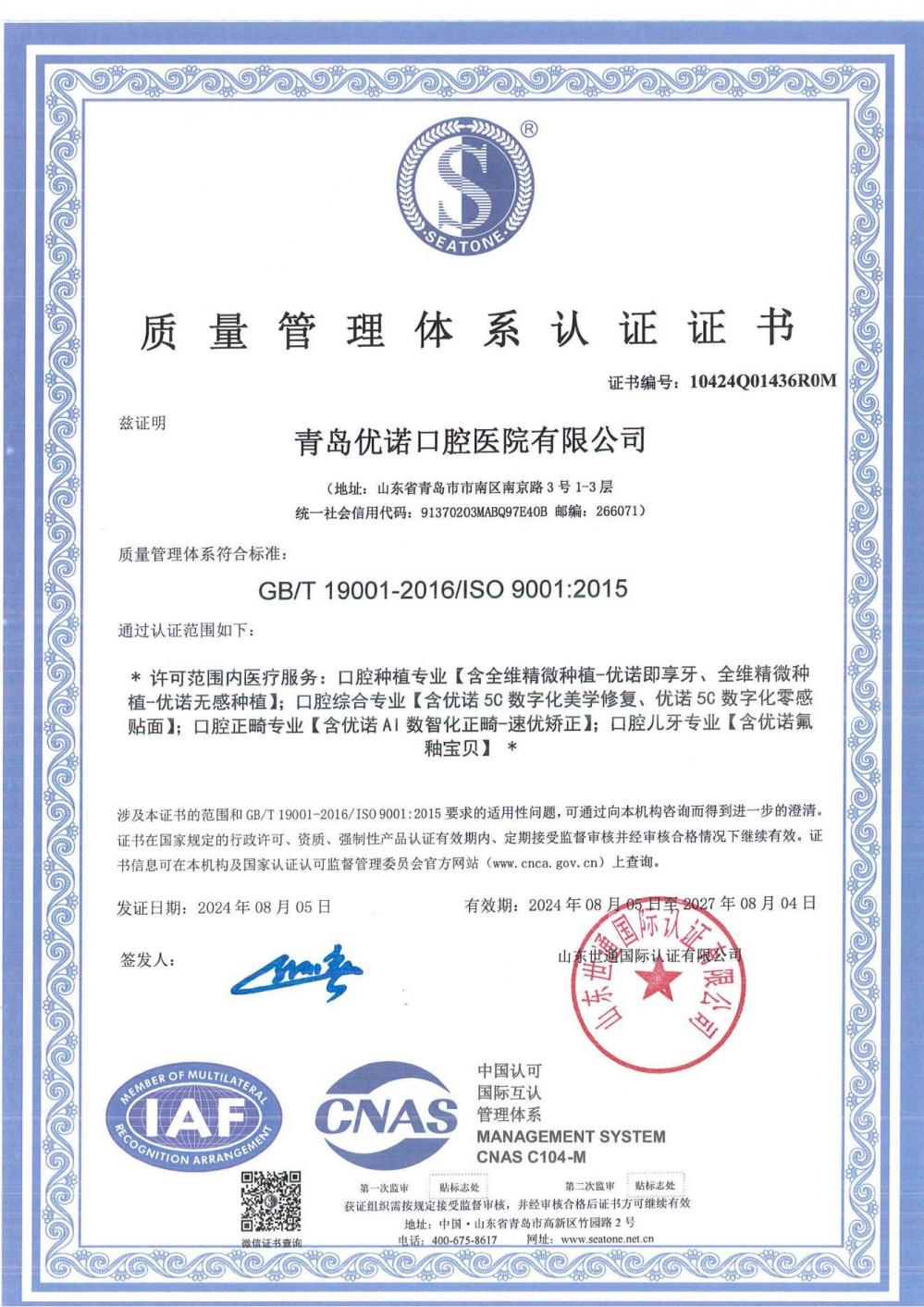 国际认证,品质保障!优诺口腔荣获ISO9001国际质量管理体系权威认证