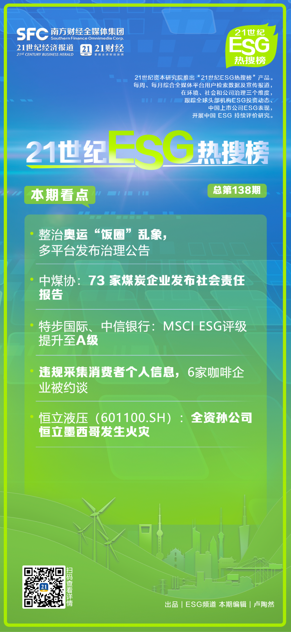 21世纪ESG热搜榜(第138期)丨整治奥运“饭圈”乱象,多平台发布治理公告;73 家煤炭企业发布社会责任报告