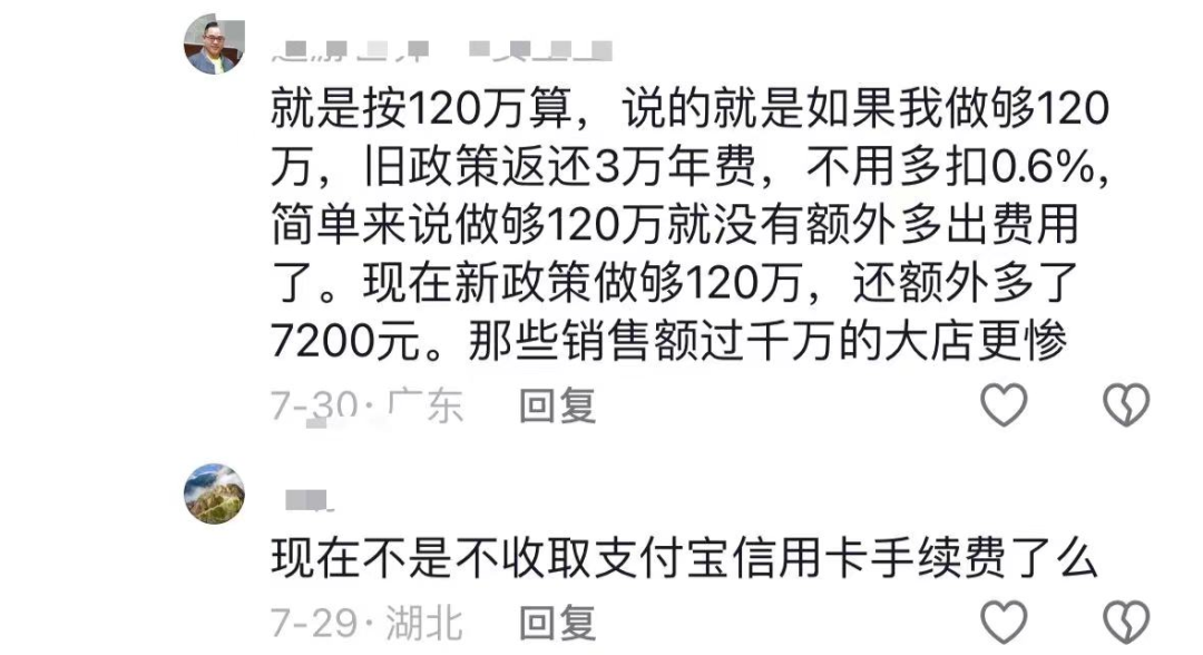这样的测算结果虽然不够精确,但更明显可计的是卖家的经营成本变化。社交媒体平台上,有网友粗略计算,如果店铺年营收达到120 万元,旧政策会返还 3 万元年费,不需要多出费用;但新政策做够了120万元,还额外多每年7200元的扣点。而对于年营收上千万元的大商家来说,面临的成本也将更高。
