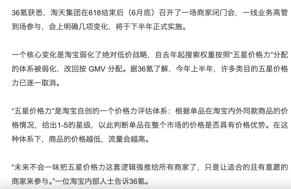 淘天也在积极调整。今年7月,据“36氪”报道,淘天集团在618结束后召开了商家闭门会,明确了几项变化,其中一个核心变化就是弱化了绝对低价策略,自去年起搜索权重按照“五星价格力”分配的体系被弱化,改回按GMV分配。此外,今年淘宝考核的重点也转变为GMV、AAC(平均消费金额),而不再追求由低价带来的高DAC(订单量)。