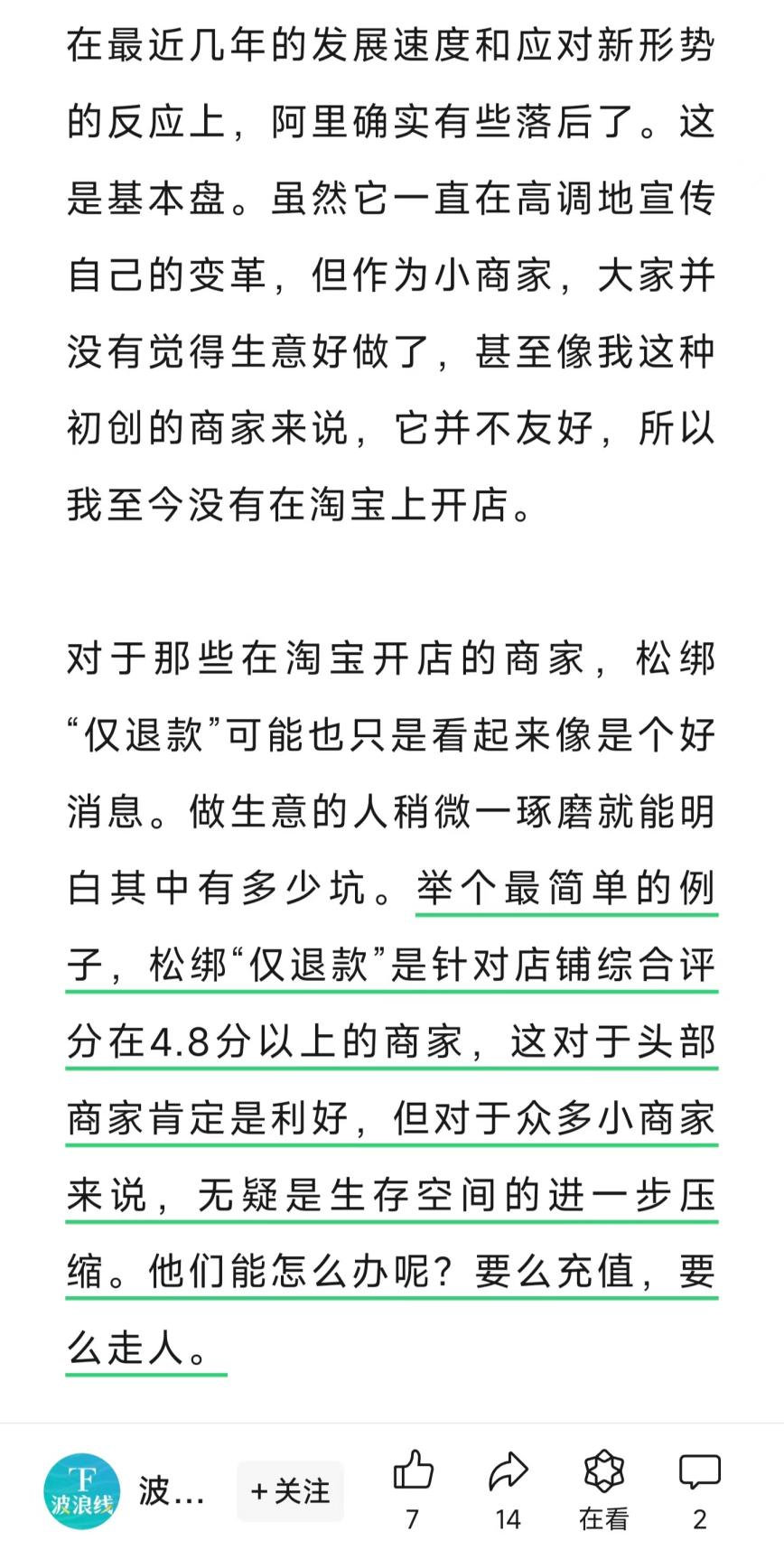 而且,由于淘宝和天猫过去几年发力“品牌路线”,有的商家和品类在本质上并不适合“仅退款”这项服务;据新媒体“晚点 LatePost”报道称,有两位阿里行业运营员工甚至认为,“仅退款”政策可能只适用于淘天10%的商品。