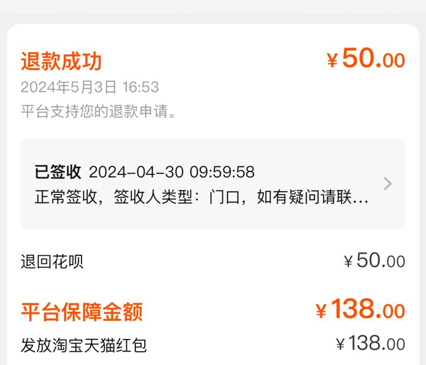 而处理的结果出乎他的意料,卖家只肯接受 50 元的退款,而余下的 138 元货款,则是天猫官方出钱补偿他的“保障金”。