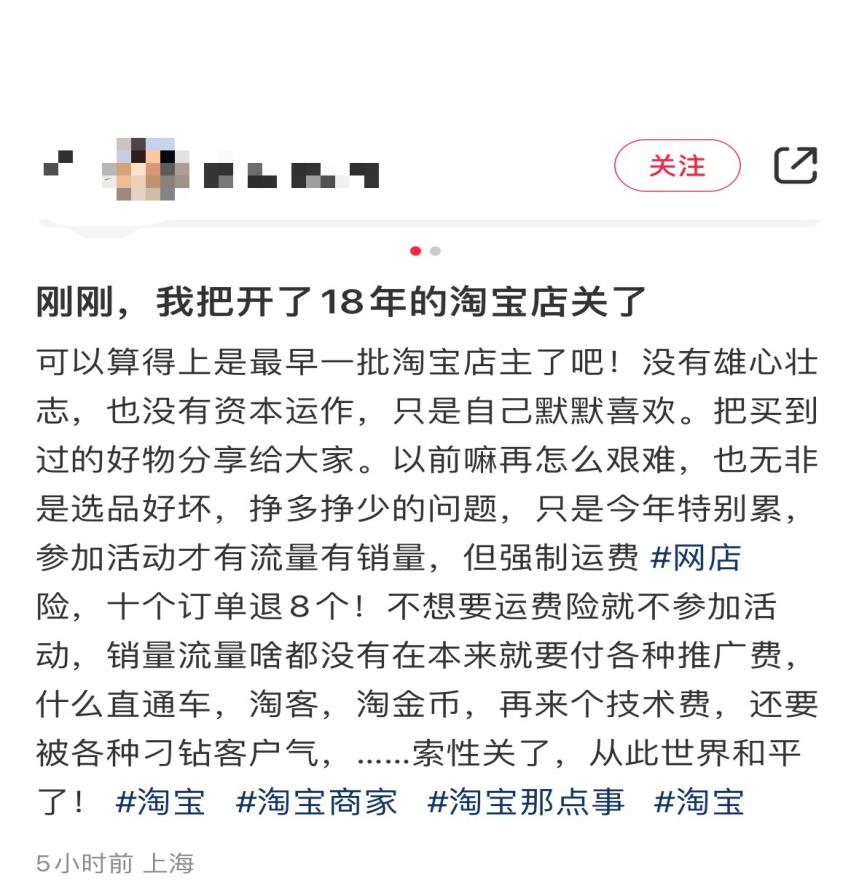 “我把开了 18 年的淘宝店关了”,8 月初,有淘宝店主在社交平台发布了这样一条内容,其表示,“我算是最早的一批淘宝店主了,今年特别累,参加活动才有流量销量,本来就要付各种推广费,再加上技术费,还要被刁钻的客户气,索性关店了事”。