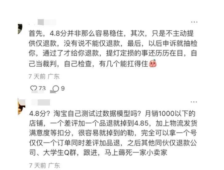 然而,4.8 分并不容易保持。有商家在社交平台公开表示:“4.8 分不是那么容易稳住的分数,月销 1000 以下的店铺,一个差评加一个品退就掉到 4.85,加上物流发货满意度等,很容易就掉到( 4.8 分以下)”。