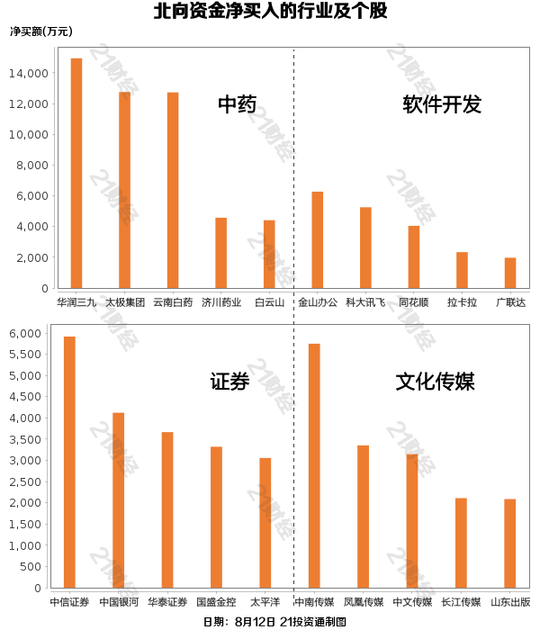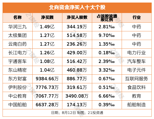 个股方面,北向资金净买入华润三九(000999.SZ)、太极集团(600129.SH)、云南白药(000538.SZ)、长江电力(600900.SH)、宇通客车(600066.SH)居前,其中,华润三九被净买入1.49亿元,太极集团被净买入1.27亿元,云南白药被净买入1.27亿元,长江电力被净买入1.26亿元,宇通客车被净买入1.08亿元。