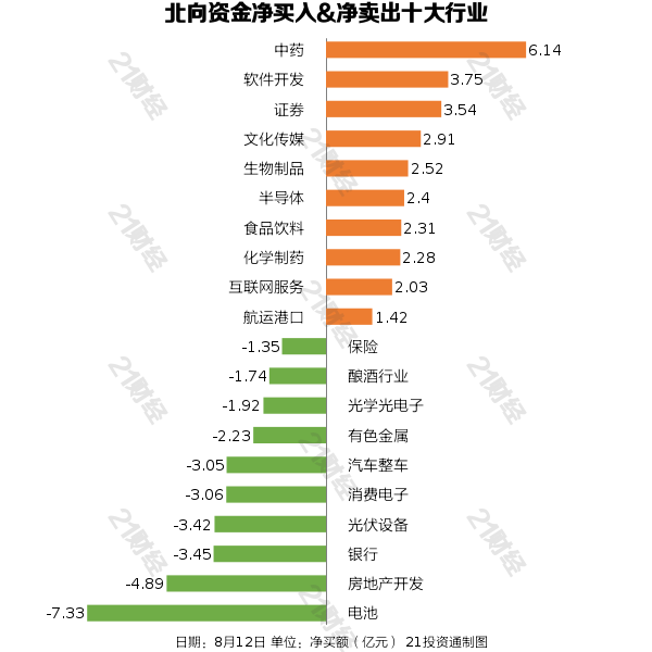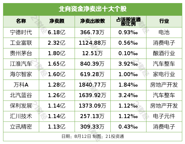 据21投资通智能监测,8月12日,北向资金净卖出7.73亿元,其中沪股通净卖出2.89亿元,深股通净卖出4.84亿元。