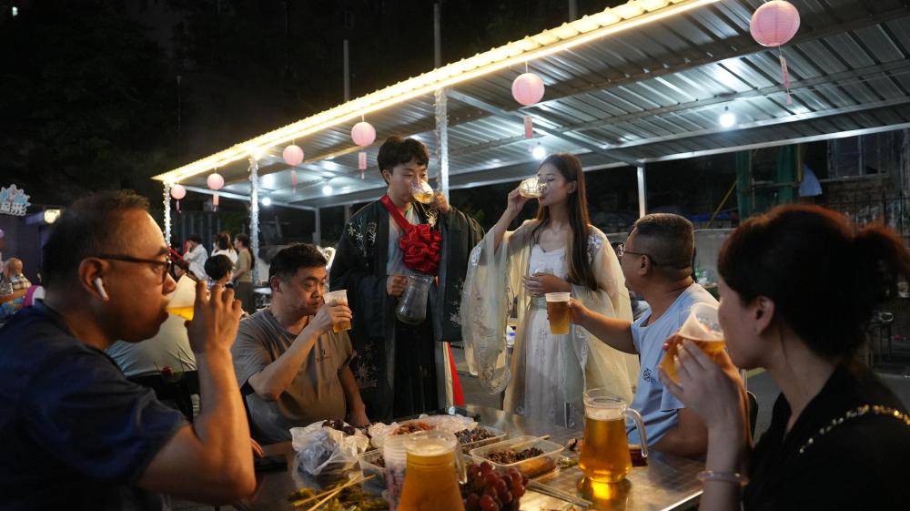 室外广场特别上演的音乐情景剧通过生动的表演和悠扬的乐声,讲述牛郎和织女感人至深的爱情故事,演员互动式表演,让观众沉浸其中。