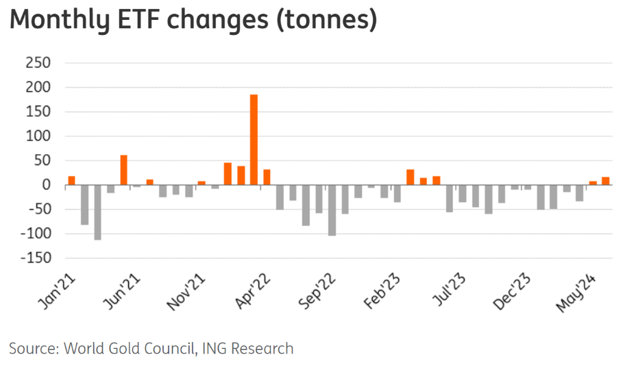 她写道:“根据世界黄金协会的数据,在经历了自2023年5月以来最强劲的一个月之后,全球黄金ETF现在连续两个月出现资金流入。”6月份,欧洲和亚洲的显著买盘抵消了北美的资金流出。