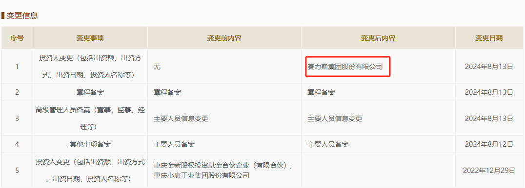 南财快讯记者注意到,国家企业信用信息公示系统显示,赛力斯汽车的股权结构已经发生变更。按照公告披露的履约安排推断,赛力斯或已经将股权转让价款以现金方式支付至金新基金指定银行账户。