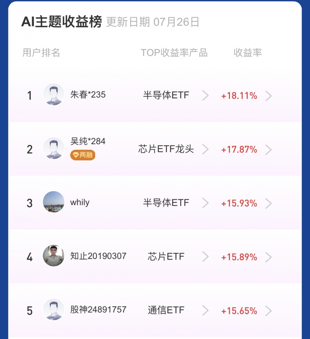 “关注不同收益榜单排名靠前的选手,有助于我了解市场高手投资偏好和策略,促使我更加专注研究市场与行业。”在ETF夏季巅峰赛“玩转AI”主题中,以18.11%收益斩获第一名的朱先生表示,这次大赛不仅能通过多元榜单与各路高手互相比拼,还在“每日热点板块”功能中增强了用户对市场环境和板块热点的理解,为投资者提供了学习投资策略机会,“通过比赛,我也直观感受到大家对投资、对市场的热爱。我相信,只要我们在市场起伏中保持耐心与信心,黎明就在前方。”