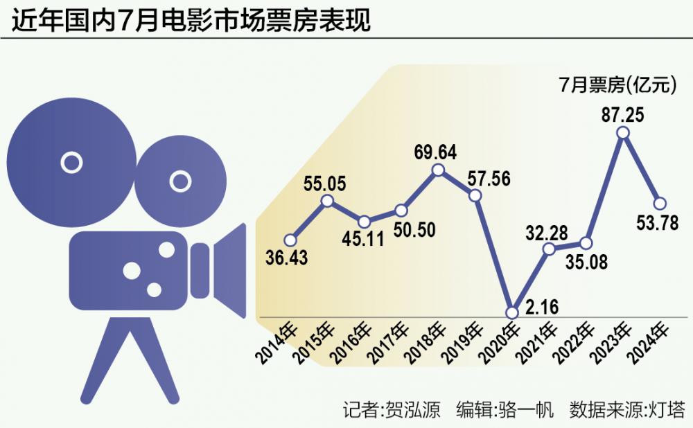 另据灯塔数据,2024年7月,全国票房53.78亿元,同比下降38.4%。今年暑期档票房超过10亿元的爆款影片只有两部,与去年四部超过10亿元体量影片“接力”上映差距明显。