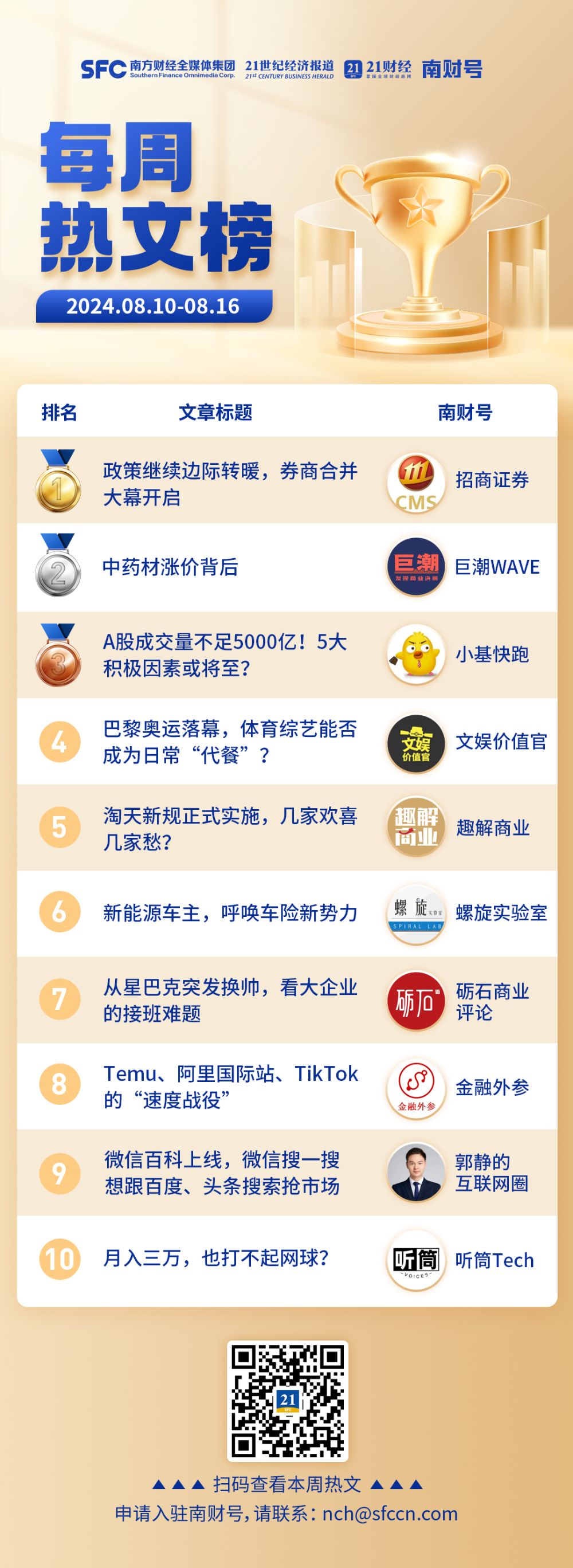 南财号每周热文丨政策继续边际转暖,券商合并大幕开启