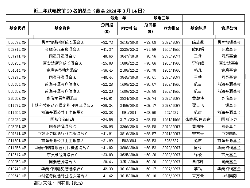 数据显示,近三年跌幅最大的民生加银创新成长混合A是一只偏股混合型基金,成立于2018年12月26日,基金经理为陈洁馨。从业绩表现来看,截至8月14日该基金成立以来跌幅39.32%,2024年以来跌幅29.38%,在同类4135只基金排在第4021位,近一年跌32.73%,在同类3848只基金排在第3610位。
