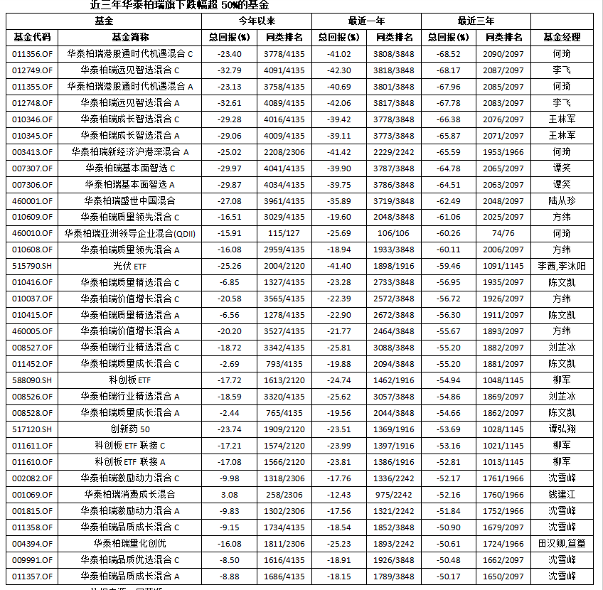 华泰柏瑞旗下近3年跌幅超60%的基金分别是,华泰柏瑞港股通时代机遇混合C、华泰柏瑞远见智选混合C、华泰柏瑞港股通时代机遇混合A、华泰柏瑞远见智选混合A、华泰柏瑞成长智选混合C、华泰柏瑞成长智选混合A、华泰柏瑞新经济沪港深混合A、华泰柏瑞基本面智选C、华泰柏瑞基本面智选A、华泰柏瑞盛世中国混合、华泰柏瑞质量领先混合C、华泰柏瑞亚洲领导企业混合(QDII)、华泰柏瑞质量领先混合A。当中,前7只产品的跌幅均超65%。