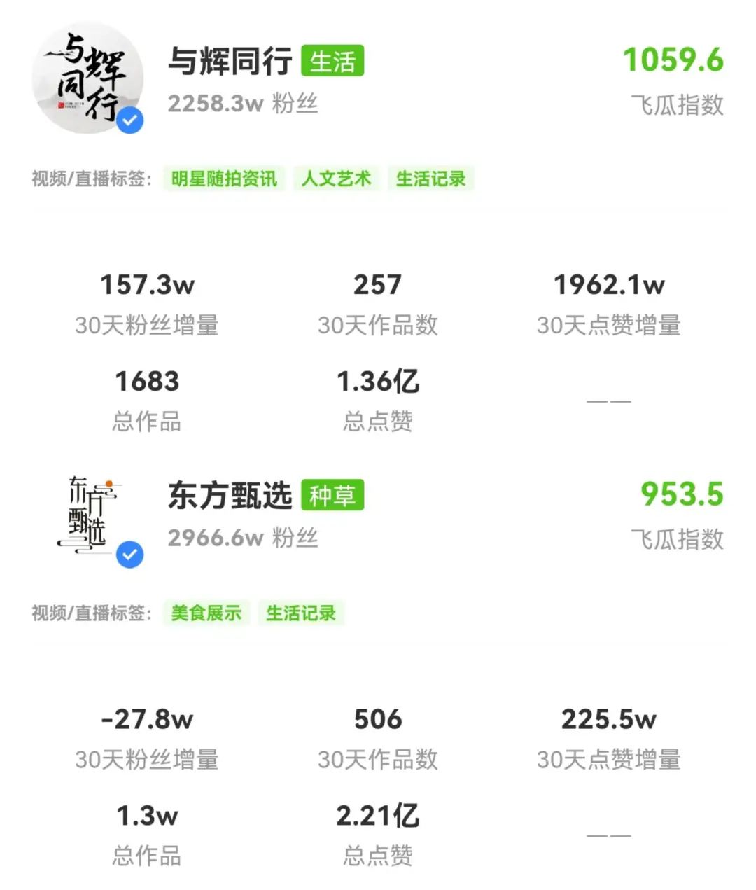 没做好,粉丝去哪了呢——去了与辉同行。据飞瓜数据,与辉同行近30天的粉丝增量为157.3万,点赞增量1962.1万。东方甄选这边就惨了,近30天点赞增量连前者零头都没有不说,粉丝量还减少了27.8万。相比而言,董宇辉确实更适合直播。