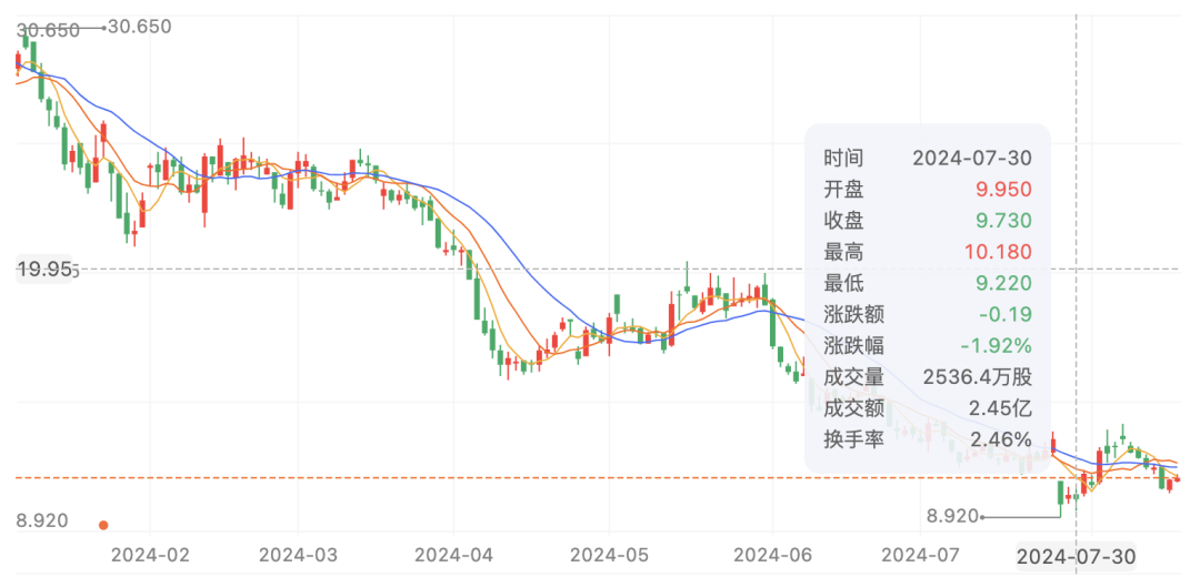 起来双方的态度是好聚好散,但在港股市场上,东方甄选7月26日开盘后遭遇了股价的急剧下跌,跌幅一度超过30%,最终收跌23.39%,创下了上市以来最大的单日跌幅记录。如果我们将时间线拉回到2024年的1月2日,当时东方甄选的开盘价为28港元,而到了7月30日收盘时,其股价已经跌至9.730港元,这意味着年内股价跌幅达到了65.3%,与2023年初的股价高点75.55港元相比,东方甄选的股价下跌了87.1%,市值减少了678.6亿港元。