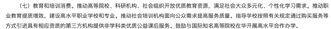 通日前,国务院出台《关于促进服务消费高质量发展的意见》,其中提到了教育和培训消费。不少人认为,这预示着教培行业将要回暖。但要注意的是,文件中强调的是推动开放优质教育资源、职业教育提质增效、建设高水平职业学校和专业以及引进具有相应资质的第三方机构提供非学科类优质公益课后服务,这并不等同于校外培训。