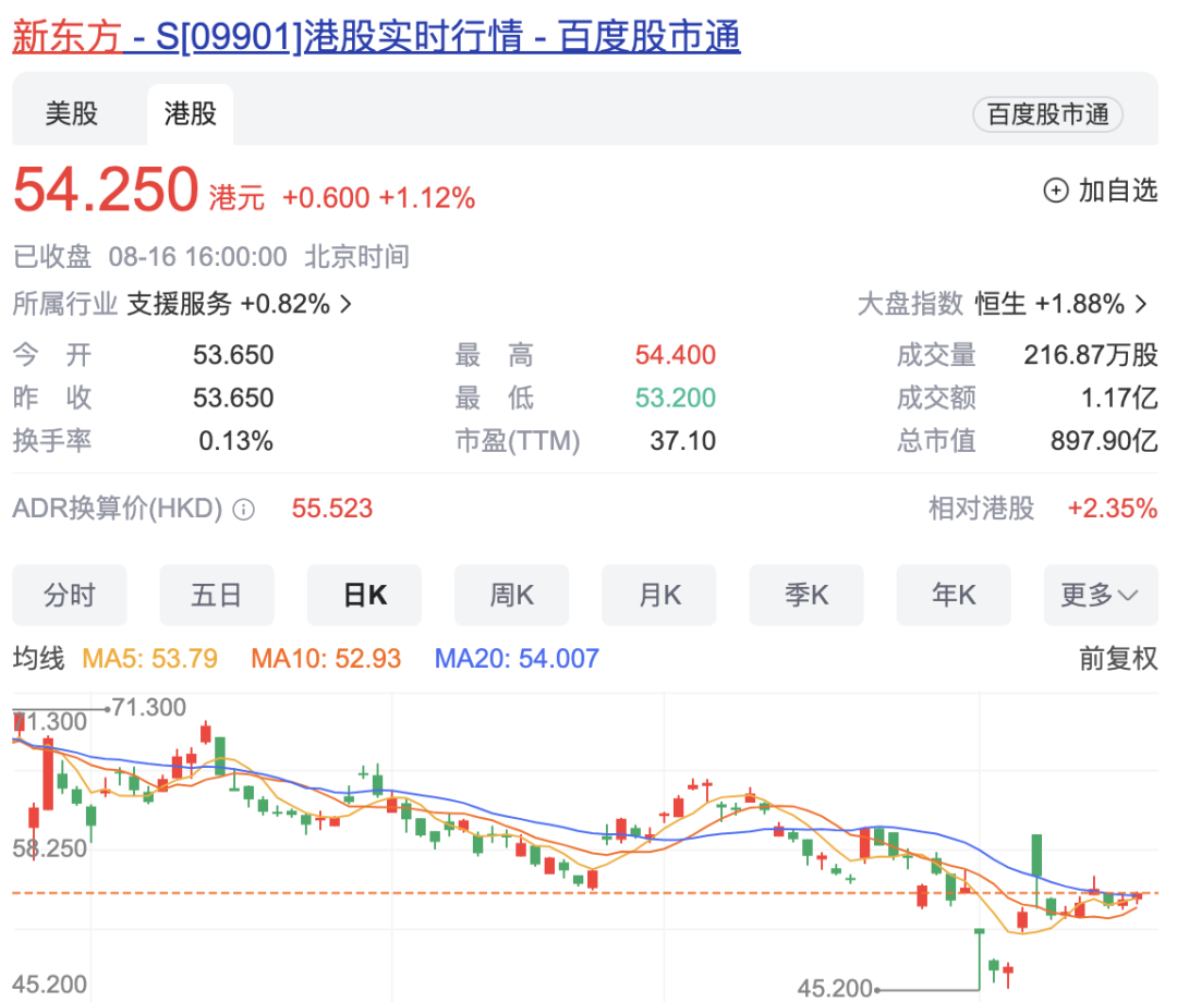 虽然东方甄选近两年总上热搜,但其前身新东方在线,整合了新东方集团所有的线上教育业务。2017年,新东方在线在新三板挂牌上市,但于2018年摘牌,随后转向港股市场。2021年,随着教培行业受到严格监管,新东方在线开始业务转型,这才有了东方甄选。目前,整个新东方集团的教育板块实际上也在回暖,教育行业“一哥”俞敏洪并不是只靠董宇辉赚钱,他依旧有自己的基本盘,新东方(指新东方教育科技集团有限公司,非东方甄选)897.9亿港元的市值,也主要来自教育业务。