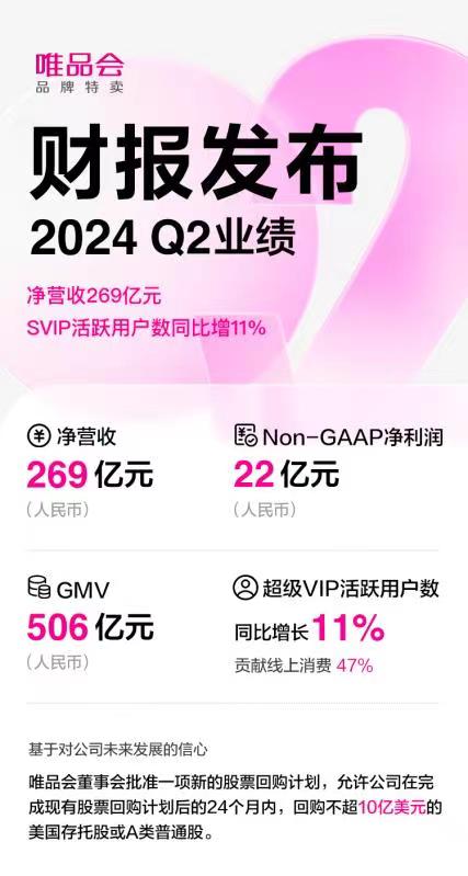 唯品会发布2024年第二季度财报:净营收269亿元,SVIP活跃用户数同比增11%