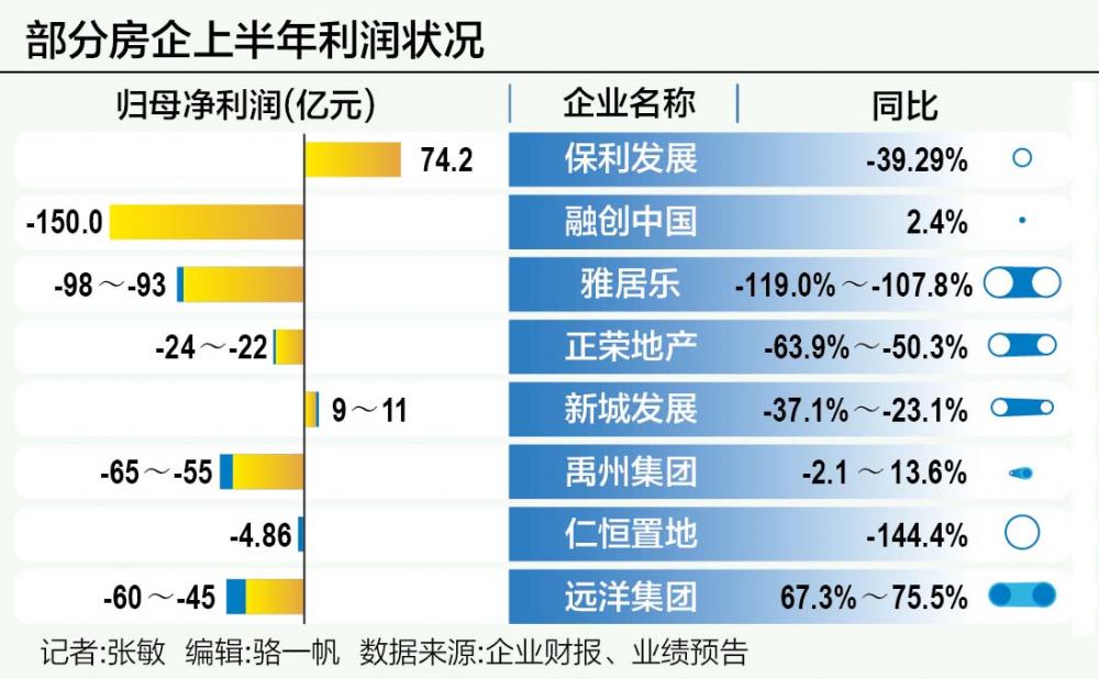 今年上半年,仍有少数企业保持盈利。保利上半年营业总收入1392.49亿元,同比增长1.62%;净利润106.98亿元,同比减少29.00%。虽然属于“增收不增利”,但在当前的市场环境下,保持利润为正已属少见。