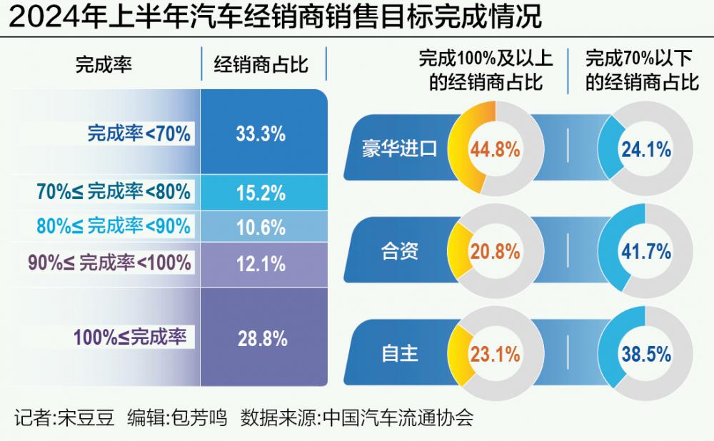 8月21日,中国汽车流通协会发布《2024年上半年全国汽车经销商生存状况调查报告》(以下简称“报告”),在上半年汽车市场保持增长态势的情况下,经销商新车销售亏损严重,新车毛利贡献为负数,销售目标完成度下滑,以价换量的策略使其生存状况进一步恶化。