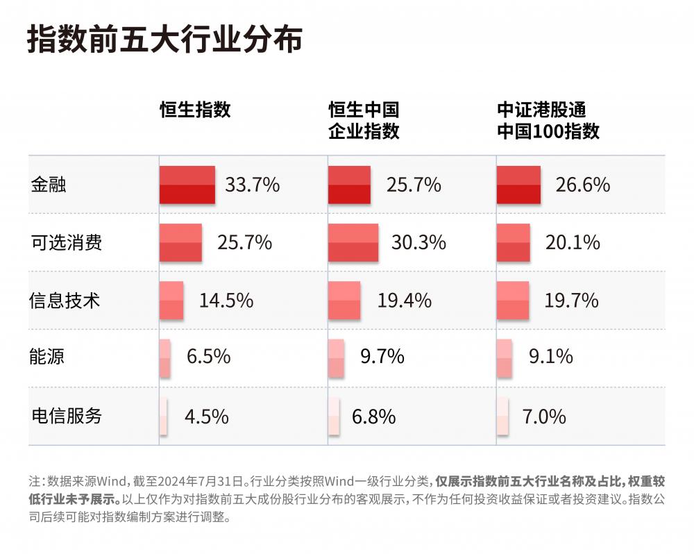从行业分布来看,这三只指数的前五大行业相同,分别为金融、可选消费、信息技术、能源和电信服务。