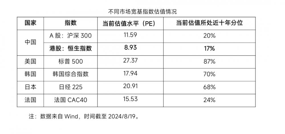 以恒生指数为例,当前其市盈率和所处分位低于美国、日本、韩国、法国等海外市场,也低于A股。