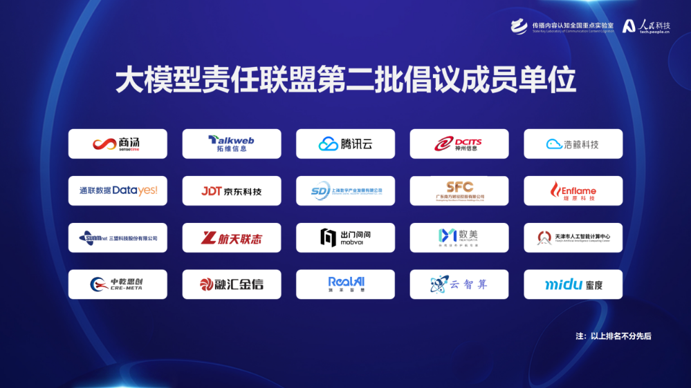 联盟第二批成员单位共20家,分别是商汤科技、拓维信息、腾讯云、神州信息、浩鲸科技、通联数据、京东科技、上海数产、南方财经、燧原科技、三盟科技、航天联志、出门问问、数美科技、天津市人工智能计算中心、中乾思创、融汇金信、瑞莱智慧、云智算、蜜度。