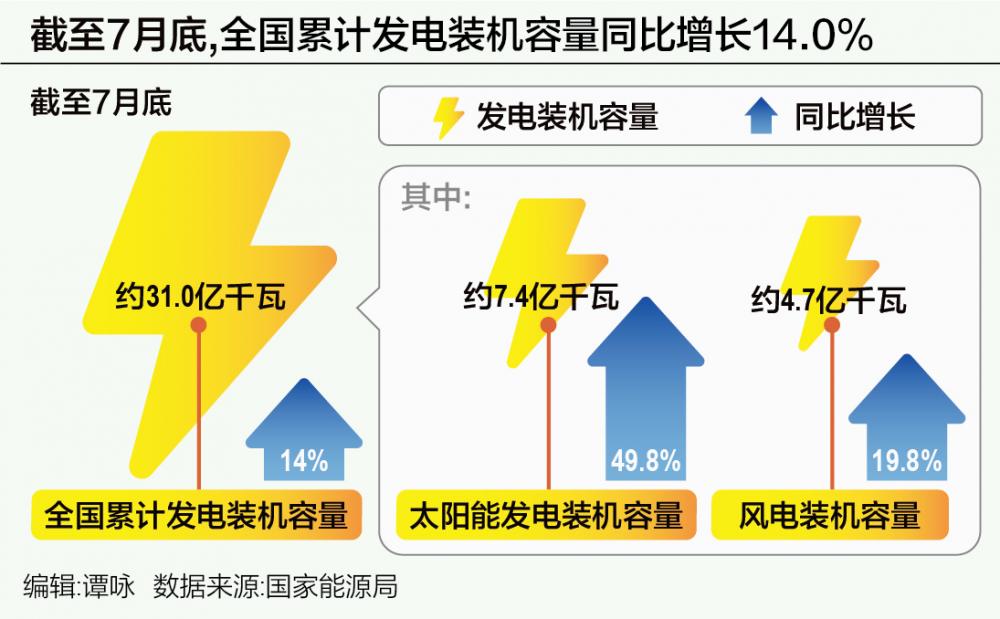 据国家能源局网站消息,截至7月底,全国累计发电装机容量约31.0亿千瓦,同比增长14.0%。其中,太阳能发电装机容量约7.4亿千瓦,同比增长49.8%。