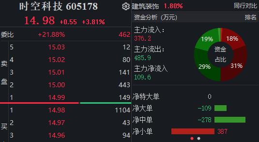 今日,时空科技收报14.98元/股,涨3.81%。