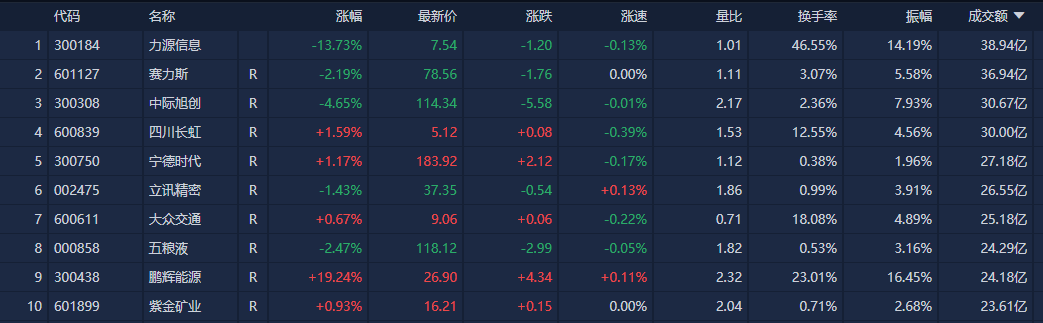 个股方面,力源信息、赛力斯、中际旭创、四川长虹成交额居前,分别为38.94亿元、36.94亿元、30.67亿元、30.00亿元。