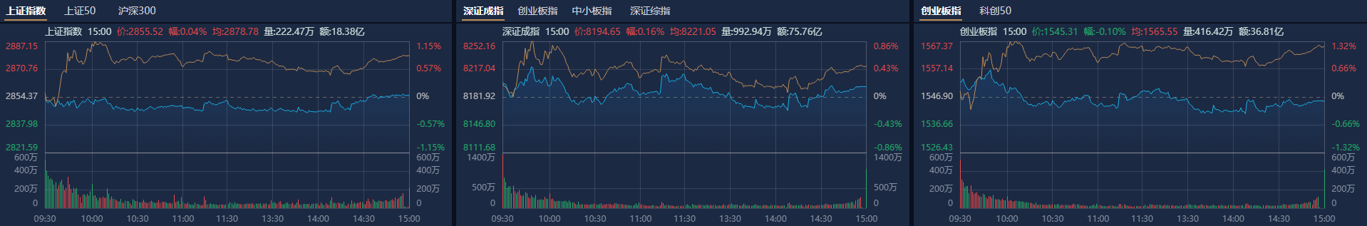 市场全天震荡分化,三大指数涨跌不一。南财金融终端显示,截至收盘,沪指涨0.04%,深成指涨0.16%,创业板指跌0.1%。