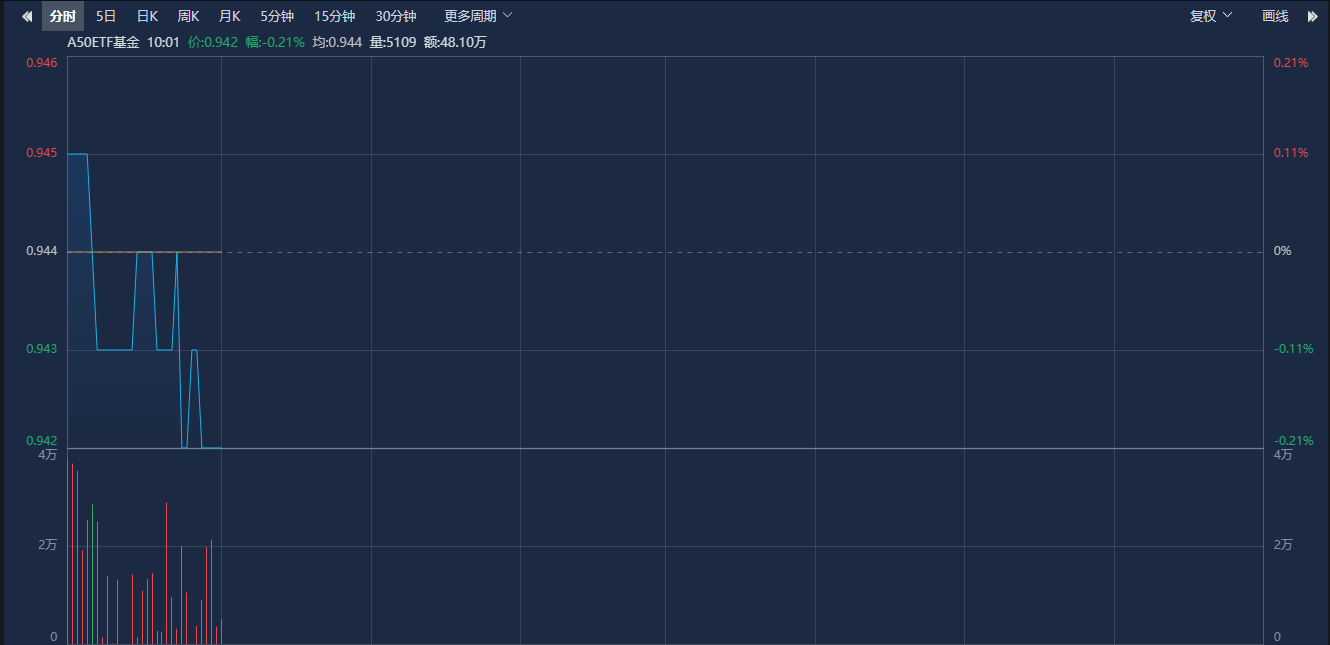 相关ETF方面,A50ETF基金(159592)截至发稿下跌0.21%,成交额超4500万元,换手率超1%,盘中交投活跃。Wind数据显示,该ETF连续两日获资金净流入。