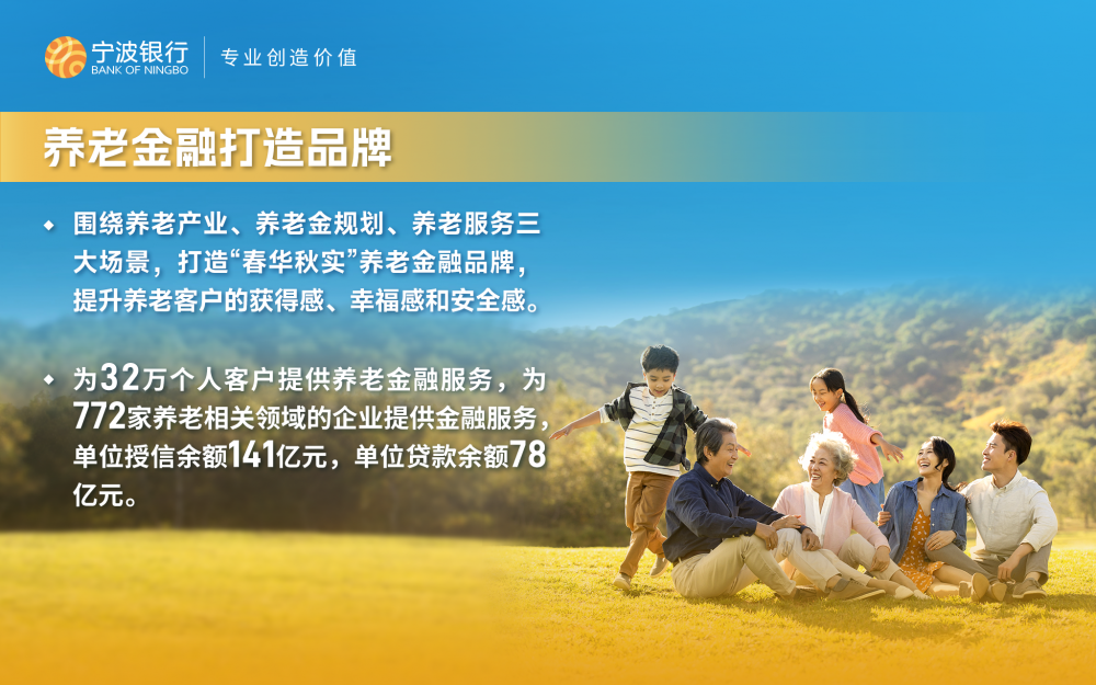 在养老金融上,专业温情,共筑幸福养老新篇章。宁波银行围绕养老金融客群的综合金融服务需求,结合养老产业、养老金规划、养老服务三大场景,完善“账户、产品、服务” 三大体系,打造“春华秋实”养老金融品牌,完善专业、智能、有温度的服务体系,这些举措共同构成了宁波银行养老金融服务的专业、智能、有温度的服务体系,共筑幸福养老新篇章。
