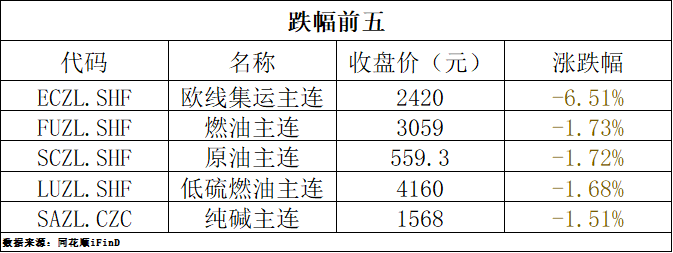 跌幅方面,欧线集运跌超6%,燃油、原油、低硫燃油、纯碱跌超1%。