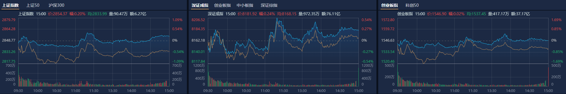 市场全天延续反弹,创业板指领涨。南财金融终端显示,截至收盘,沪指涨0.68%,深成指涨2.38%,创业板指涨2.53%。