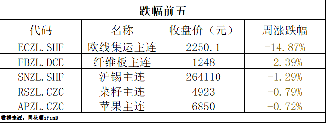 上周国内期货主连跌幅位居前五的分别是欧线集运-14.87%、纤维板-2.39%、沪锡-1.29%、菜籽-0.79%、苹果-0.72%。