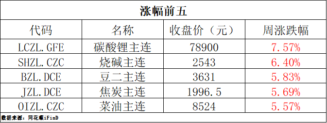 上周国内期货主连涨幅位居前五的分别是碳酸锂7.57%、烧碱6.40%、豆二5.83%、焦炭5.69%、菜油5.57%。