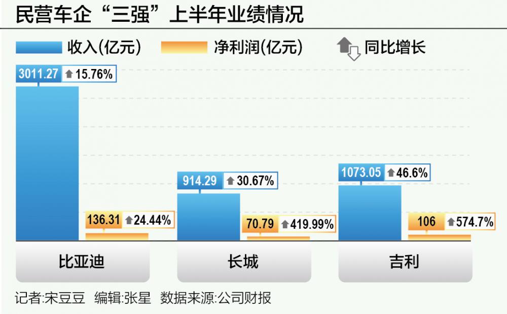 此前多年,长安汽车、长城汽车、吉利汽车称霸自主前三,2017年吉利夺走长安的冠军宝座,直到2021年吉利仍位列销冠,长安和长城在二、三名交替。但2022年以来,押注新能源的比亚迪成为国内销冠,位次被打乱。今年上半年比亚迪一举超越上汽集团,成为营收、净利最高的车企。